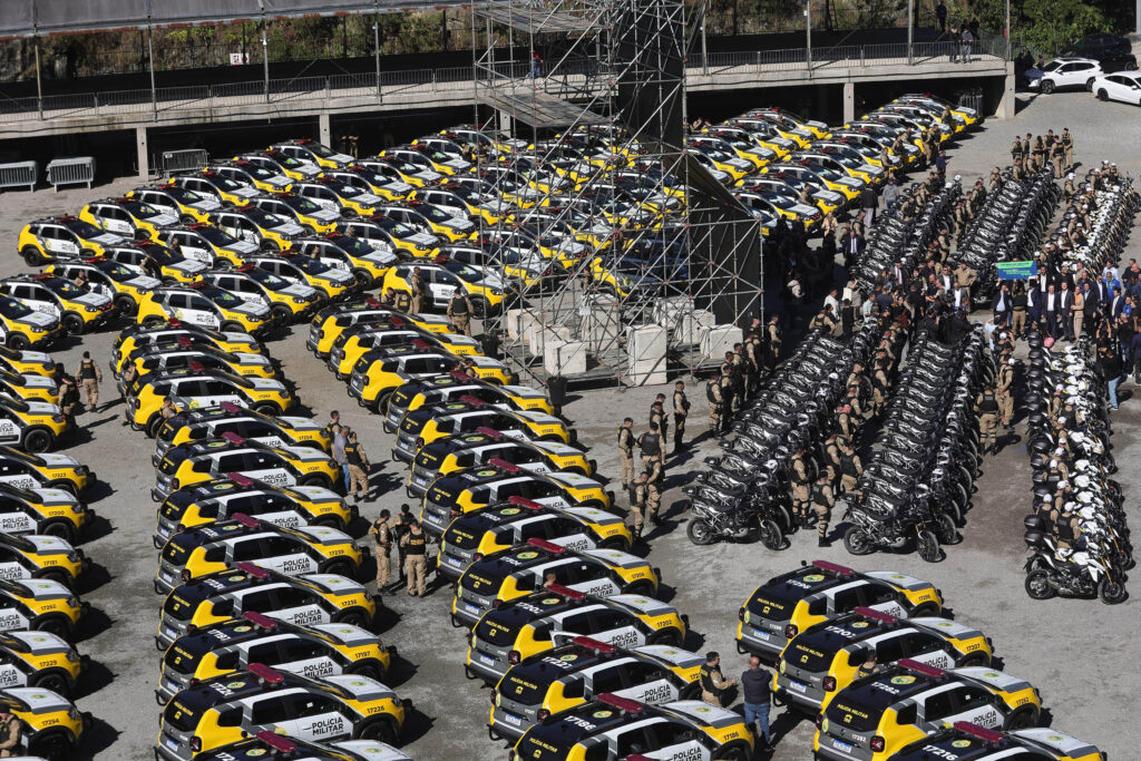 O governador Carlos Massa Ratinho Junior entregou nesta terça-feira (17) 209 motocicletas e 222 automóveis novos para as forças tática e operacional da Polícia Militar do Paraná (PMPR). Foram investidos R$ 63,2 milhões para a renovação da frota de viaturas, que serão distribuídos para diversas unidades da PMPR, incluindo o Batalhão de Operações Especiais (BOPE) e a Patrulha Maria da Penha.