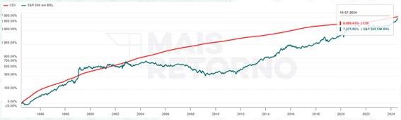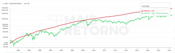 Desde julho de 1994, marco do início do Plano Real, o CDI acumulou uma valorização próxima de 8.100%, enquanto o Ibovespa ficou em torno de 3.500%.