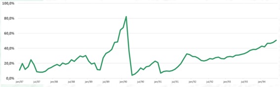 Naquele período, a SELIC mensal chegou a 80% em fevereiro de 1990. Imagine um título de renda fixa entregando 80% em um único mês. Isso de fato aconteceu, mas não representava prosperidade: era apenas reflexo da hiperinflação. Na prática, mesmo com rentabilidades mensais tão elevadas, o poder de compra se corroía ainda mais rápido.