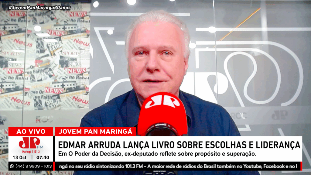 O ex-deputado federal Edmar Arruda esteve na Jovem Pan Maringá para apresentar seu novo livro, O Poder da Decisão. Na obra, ele discute como as escolhas moldam a trajetória pessoal e profissional, inspirando o leitor a agir com propósito e responsabilidade. Arruda afirma que a motivação para escrever veio das experiências acumuladas como empresário, filantropo e político.