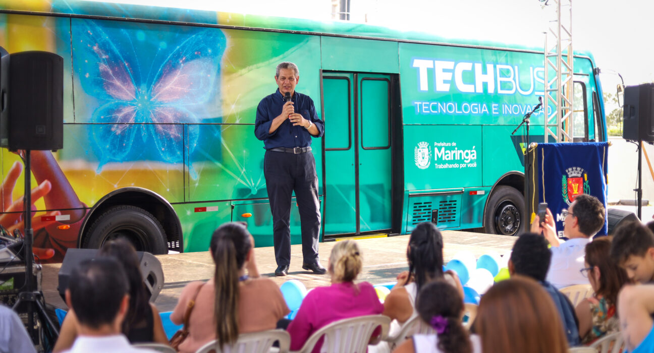 A Prefeitura de Maringá lançou nesta quinta-feira (5) o TechBus, um projeto itinerante que levará tecnologia e inovação para escolas da rede municipal de ensino. O lançamento ocorreu na Escola Municipal Geraldo Altoé, com a proposta de aproximar os estudantes das ferramentas tecnológicas e estimular o interesse por áreas ligadas à ciência e à inovação.