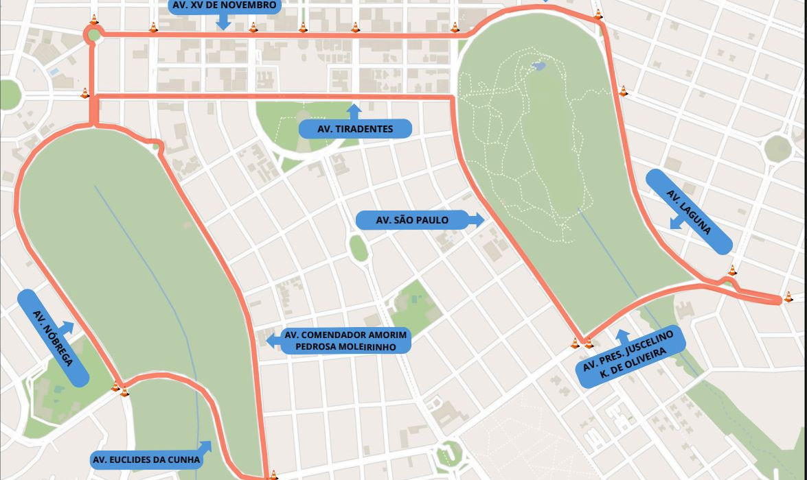 Bloqueios – O trajeto de 10 quilômetros da 49ª Prova Rústica Tiradentes estará bloqueado para o tráfego de veículos a partir das 6h30 de terça-feira, 21. Além do trecho da Avenida Tiradentes até a Avenida São Paulo, a programação da Semob inclui bloqueios no entorno do Parque do Ingá, passando pelas avenidas Juscelino Kubitschek e Laguna, seguindo até a XV de Novembro. Também serão interditadas vias do entorno do Bosque II, como as avenidas Nóbrega, Euclides da Cunha e Itororó.